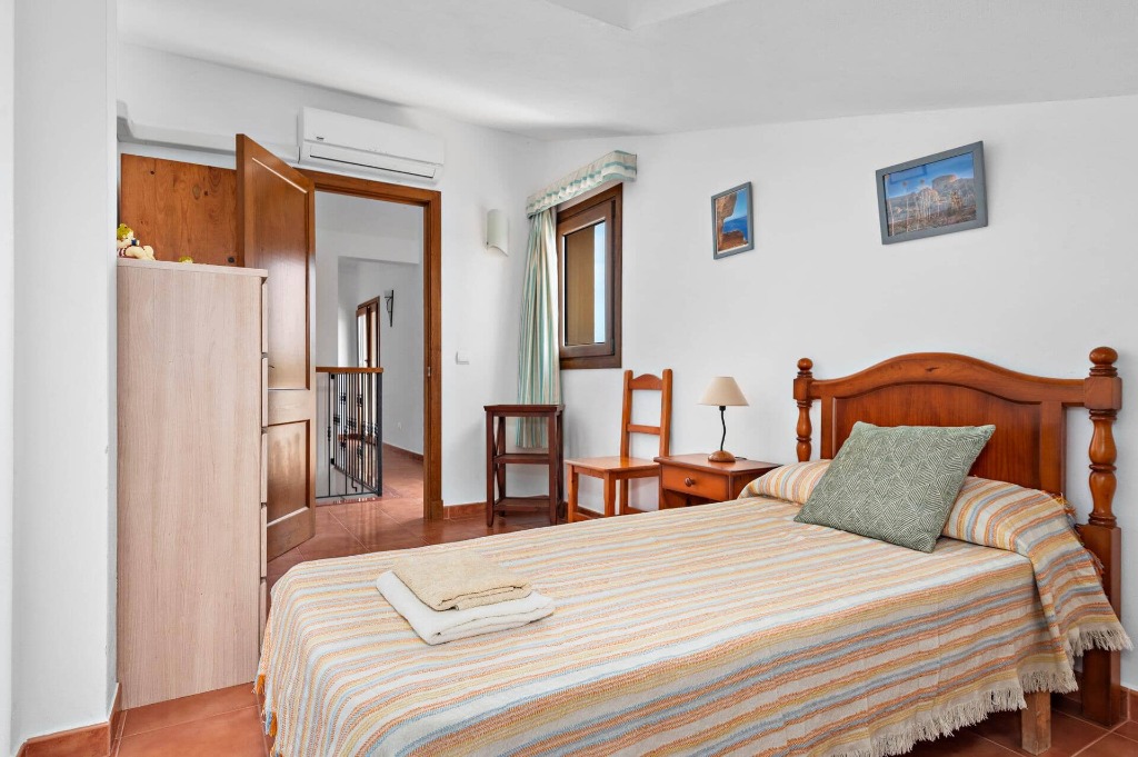 Inside, the ground floor offers three twin bedrooms, one with direct access to the terrace and pool area, along with two shower rooms. The lounge and dining area open onto the covered terrace, creating a seamless indoor-outdoor living space. The first floor includes two double bedrooms, each with a terrace overlooking the front of the property, one single bedroom suitable for children, and two additional bathrooms.