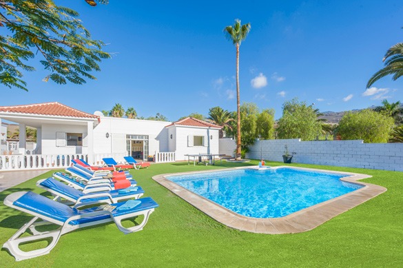 Outside, the private pool takes centre stage, surrounded by artificial grass and sun loungers for ultimate relaxation under the Canarian sun. A covered terrace provides a shaded seating area, and a dining table allows for alfresco meals with family or friends.