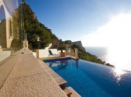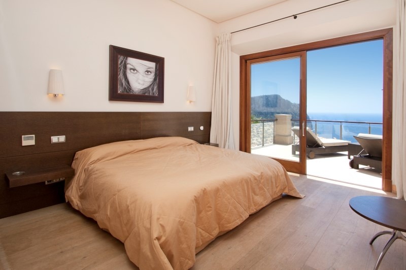 Accommodating up to 10 guests, the villa features five bedrooms and four bathrooms. A separate guest apartment ensures privacy for visitors, while a gym, sauna, and wine cellar provide additional comfort and indulgence. The impressive entrance hall immediately reveals stunning sea vistas, and the villa's layout is designed for both relaxation and entertainment. One wing houses the main bedroom with a private terrace, while the opposite wing includes two guest bedrooms with en suite bathrooms sharing a large terrace, alongside a home cinema that can also serve as an additional bedroom.