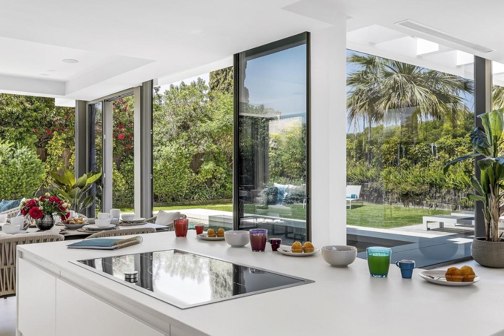 The property spans three light-filled, glass-fronted storeys, creating a seamless connection between indoor and outdoor living. The interiors are decorated in soft neutrals with turquoise accents, offering a calm and inviting atmosphere. The open-plan living area features high-quality furnishings, a dining space for family meals, and a sleek, fully equipped kitchen with integrated, professional-grade appliances ideal for preparing gatherings or casual meals.