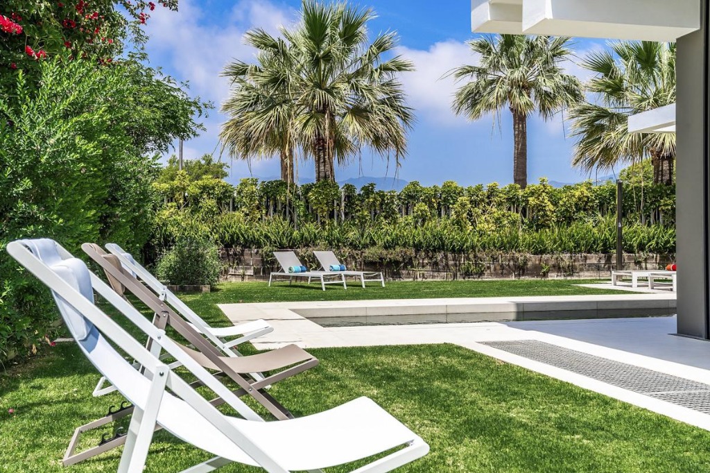 Outdoor spaces are equally impressive, featuring a rooftop terrace with various seating options and parasols, perfect for soaking in ocean views or enjoying evening drinks. The villa's garden surrounds the property with lush greenery and includes a barbecue area for alfresco dining, sun loungers for lounging, and a private pool accessible via gentle steps, suitable for guests of all ages.