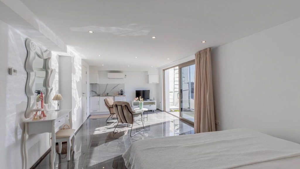 Apartment (lower garden level) - Bedroom with double bed (200 x 220 cm), ensuite bathroom, dressing room - Kitchenette and seating area with garden access - Air conditioning and underfloor heating