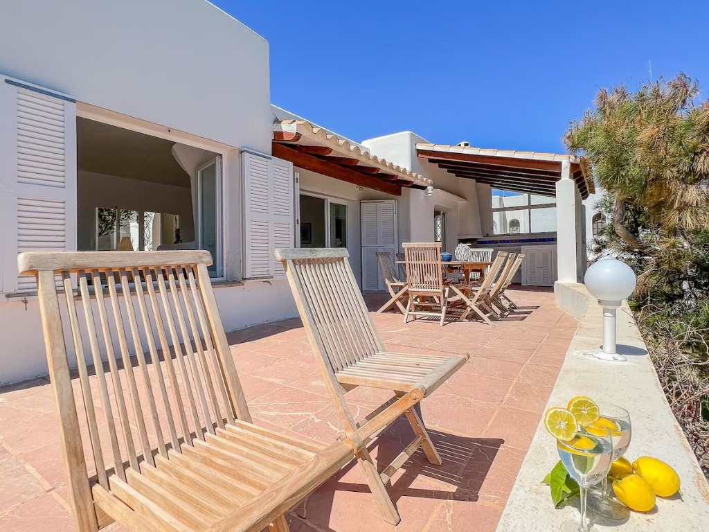 The property is arranged over two floors and offers comfortable accommodation for up to 10 guests. The ground floor features a living room with traditional brick benches, a dining area and large windows framing the sea views, with direct access to the terrace. Next to this space is a fully equipped modern kitchen. Also on this level is a double bedroom with an adjoining bathroom and direct access to the terrace. An Ibizan-style staircase leads to the first floor, where there is a second double bedroom and a separate bathroom with a shower.