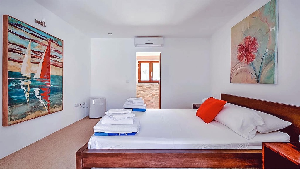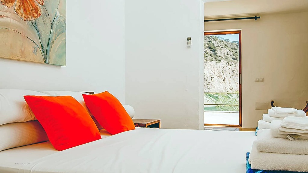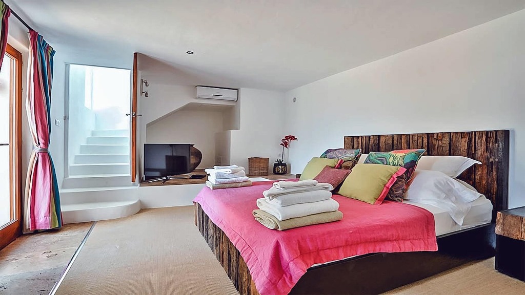 Master Suite - Secluded from the other rooms, this suite offers a large en-suite bathroom with a freestanding bath, walk-in shower, restored stone walls, and double stone washbasins. The bedroom benefits from a walk-in wardrobe, air conditioning, and stunning sea views. Bedroom 2 - King-size bed, air conditioning, carved wooden wall décor, breathtaking sea view, and shared bathroom with Bedroom 3. Bedroom 3 - Canopied four-poster bed, partial bay views, air conditioning, ample built-in wardrobe storage, private toilet, and shared bathroom with Bedroom 2. Bedroom 4 - Located away from the main house, featuring a private sun terrace, double bed, en-suite bathroom, air conditioning, and storage space, perfect for guests seeking privacy. Bedroom 5 - Also set apart from the main house, with a private terrace, double bed, en-suite bathroom, air conditioning, and storage, offering tranquil relaxation and panoramic sea views.