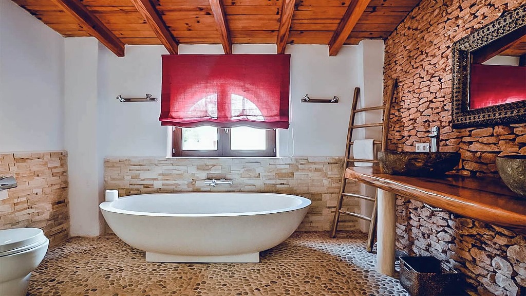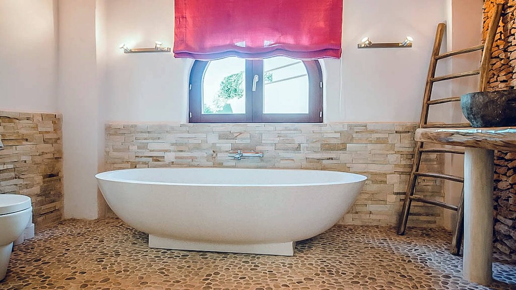 The accommodation blends traditional Ibicencan architecture with modern comforts, featuring high-quality furnishings, antique wooden doors, luxury tiled bathrooms, and floor-to-ceiling windows. The villa comprises three bedrooms in the main house and two separate guest apartments, providing an ideal balance of communal and private spaces for groups.