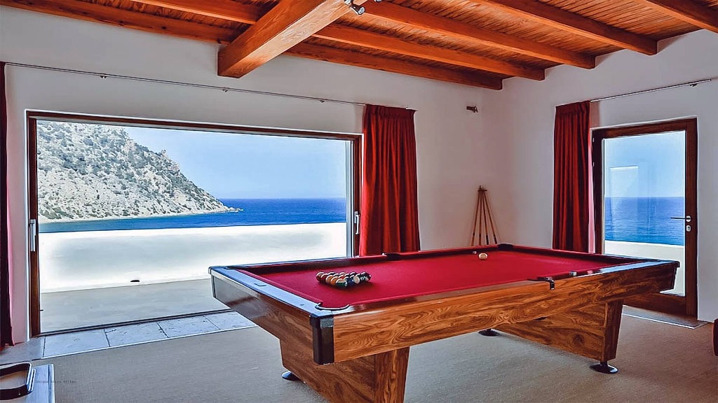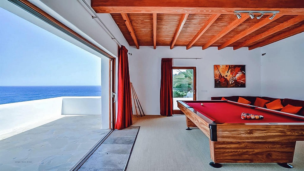 Indoor living spaces include a spacious open-plan layout with a sea-view dining area. The villa also features a fully equipped games room, complete with a full-size pool table, a warm corner sofa, and its own bathroom, offering endless entertainment for guests.