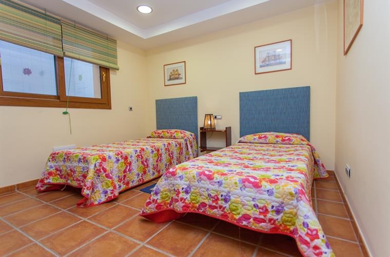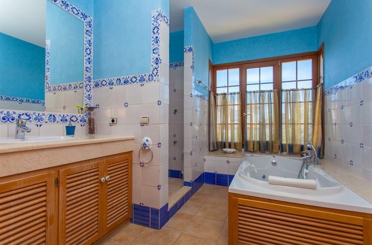 The upper floor comprises two twin bedrooms, one with an en-suite shower and the other with an en-suite bathroom, as well as a double bedroom with an en-suite bathroom. On the lower floor, there is another twin bedroom with an adjacent bathroom. All bedrooms are air-conditioned and heated.