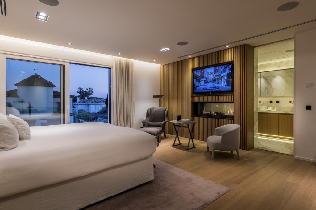 On the first floor, the master suite boasts a king-size bed, en-suite bathroom, balcony, air conditioning, satellite TV, a working desk, and a fireplace. Two additional double bedrooms, one with an ensuite, a bedroom with two single beds, and a family bathroom complete the upper level. Three of the bedrooms feature uninterrupted sea views through floor-to-ceiling windows, providing bright, airy, and luxurious retreats. All rooms are furnished with hotel-quality linens, elegant seating areas, and bespoke lighting, creating a sophisticated and relaxing atmosphere.