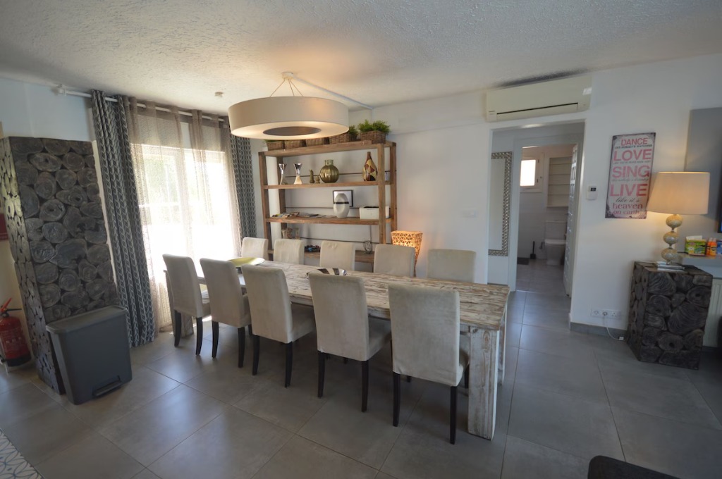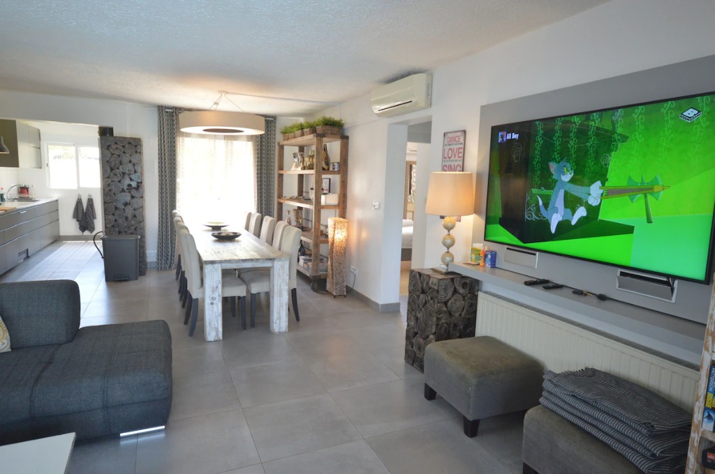 Inside, the living room includes a large sofa-bed with comfortable sleeping quality, smart TV, international channels and fast 300 MB fibre internet. The kitchen is fully equipped for group cooking. Seating areas indoors and outdoors allow everyone to eat and relax together. Central heating and 7 air-conditioning units provide comfort all year round.