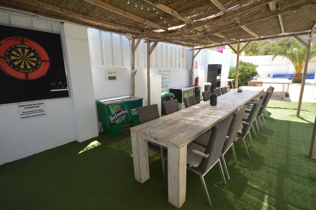 Outside, the villa features a private heated swimming pool with a special cover that allows the pool to reach 28ºC in winter. The terrace is fully integrated with the house and offers plenty of places to sit, dine and unwind. There are ergonomic loungers, shaded dining tables, chill-out corners and a stone barbecue. A games area is located on the main terrace, including an American 7ft pool table, table football, ping-pong table and professional darts. Two large beer coolers are positioned next to the outdoor dining area for convenience.