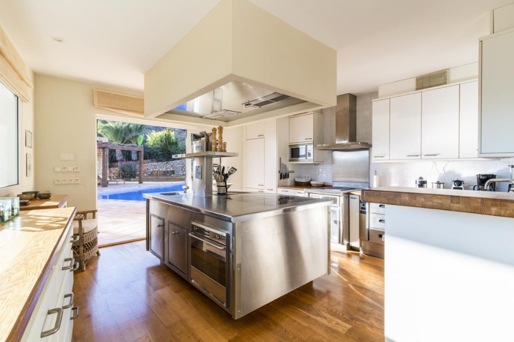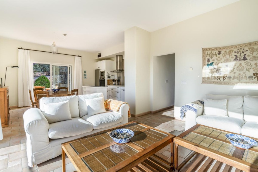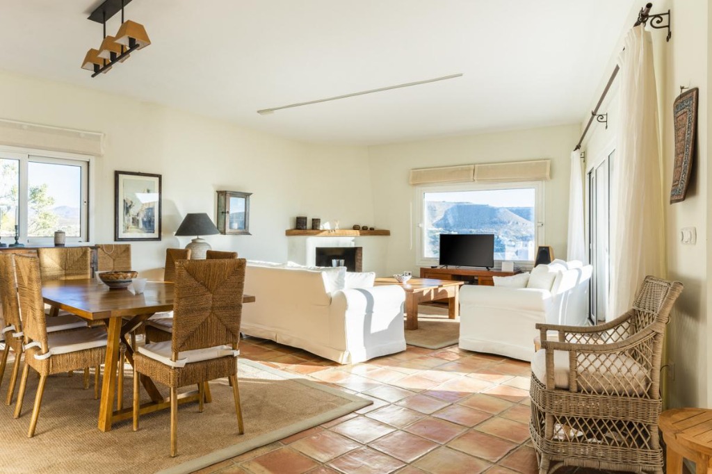 Inside, the main house combines modern elegance with comfort. The living area features white sofas, floor-to-ceiling windows, eclectic artwork, and a light-filled open-plan design. The main kitchen is fully equipped with Poggenphol appliances, central island, and French stove, with access to the pool and terraces. The dining area comfortably seats ten guests, perfect for group meals. The guest house offers a cozy living room, open-plan kitchen, dining area for six, and terraces with sea views.