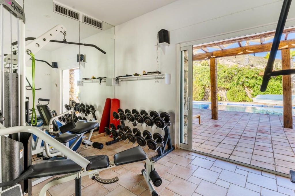 The villa's exterior is designed for leisure and socialising. A large heated pool (13 x 6 m) with pool shower and outdoor toilet is surrounded by teak decking, sun loungers, and shaded areas for relaxation. Terraces in both houses offer alfresco dining with stunning views, while palm trees and landscaped gardens add to the serene environment. A fully equipped fitness area with bike, step machine, multifunctional workout station, weights, and bench provides opportunities to stay active.