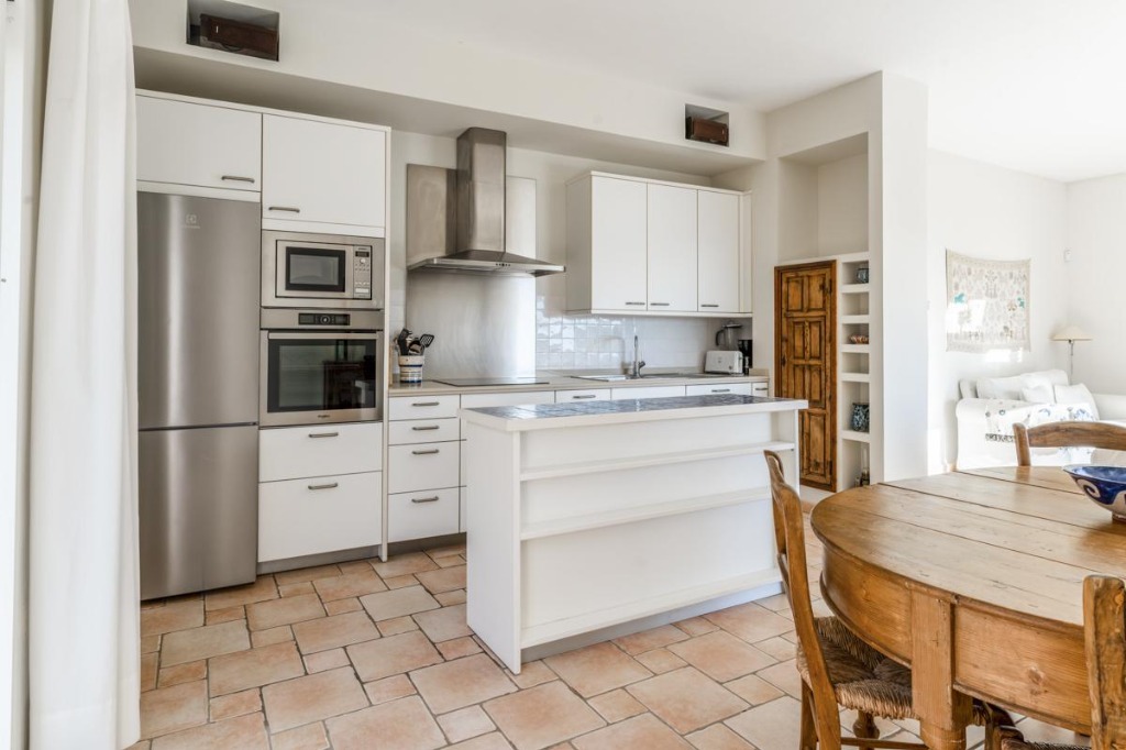 First Floor Main House: - Large living room with terrace access - Open-plan dining area for 10 - Fully equipped kitchen with central island and access to terrace and pool - Storage room - Laundry room with washer and dryer - Fitness area