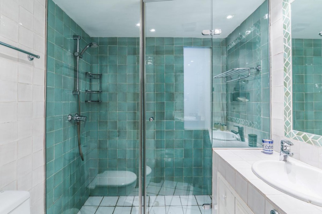 The five bedrooms, including a penthouse master suite, are designed with comfort in mind. The master bedroom features a king-size bed, en-suite bathroom, and terrace access with spectacular views. Other bedrooms include double and single beds, each with ample wardrobe space, air conditioning, and stylish décor with bright tiled floors and splashes of color.