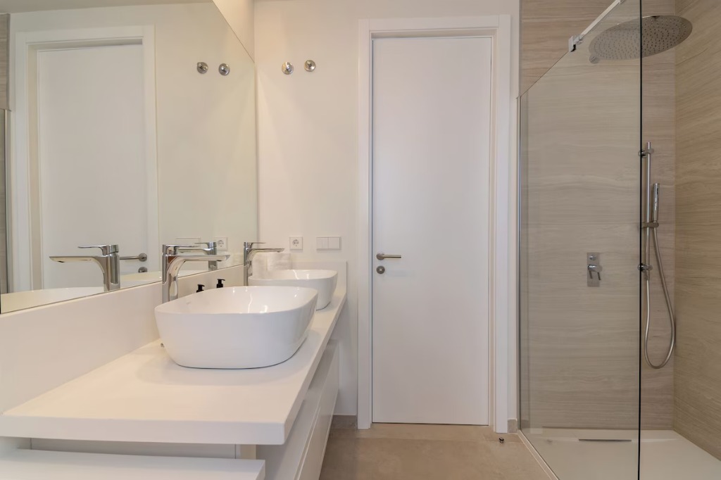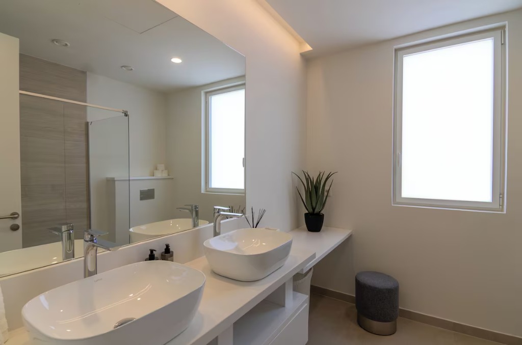 The upper floor hosts two generous double bedrooms, each with access to private terraces offering panoramic sea views. The highlight of this level is the master suite, which includes an extra-large bed, a walk-in wardrobe and a private terrace with sunbed and outdoor shower. The en-suite bathroom features double sinks, a toilet and a bathtub positioned to enjoy the sea views, creating a relaxing and luxurious atmosphere. All bedrooms are equipped with large TVs.