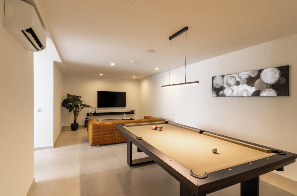 The lower floor is designed with comfort and entertainment in mind. It features a spacious family bedroom with two large double beds, ideal for accommodating multiple guests. A modern bathroom with an extra-large shower, double sinks and a toilet is also located on this level. For leisure time, there is a recreation room equipped with a pool table, a bar and a comfortable seating area with a large TV. A laundry room with a washing machine and dryer adds extra convenience for longer stays.