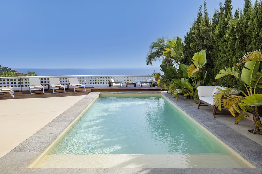 The lower level includes an independent suite, offering additional privacy. A unique feature of the property is the private cinema room for 12 people, available by reservation. The interior patio, filled with light and decorated with strelitzias, adds a fresh and exotic touch. The outdoor space is designed for relaxation, with Mediterranean gardens, a large terrace and a microcement pool surrounded by greenery. There is also a small fitness area where guests can enjoy workouts while listening to birds and cicadas.