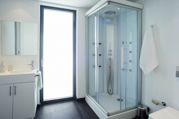 Spread over two floors, the villa showcases floor-to-ceiling glass along one entire side, creating a light-filled interior with high-spec fixtures, smooth modern furniture, and a sophisticated palette of cool neutrals. The top floor is dedicated entirely to the master suite, while two additional guest bedrooms are located on the lower level alongside the open-plan living, dining, and kitchen area.